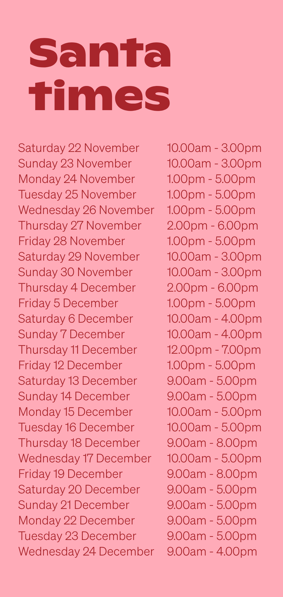 You can visit Santa between times below or book online to secure your perfect session. Choose from a variety of photo packages to suit your family’s needs.